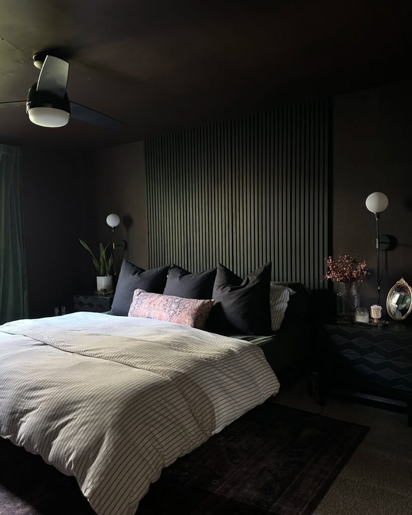 If you’re into moody but don’t want a space that feels flat, here’s your move: dark walls, a black bed, and striped bedding. Add a ceiling fan, wall lights, and a few plants, and suddenly you’ve got layers everywhere—visual, textural, and functional.