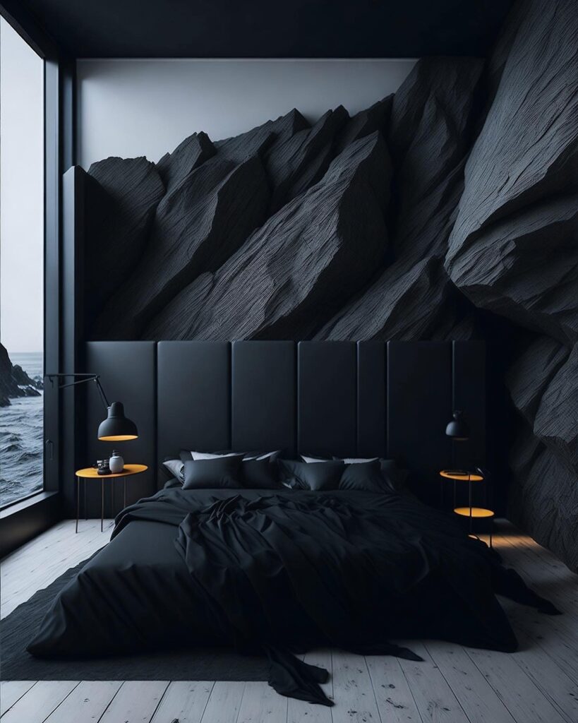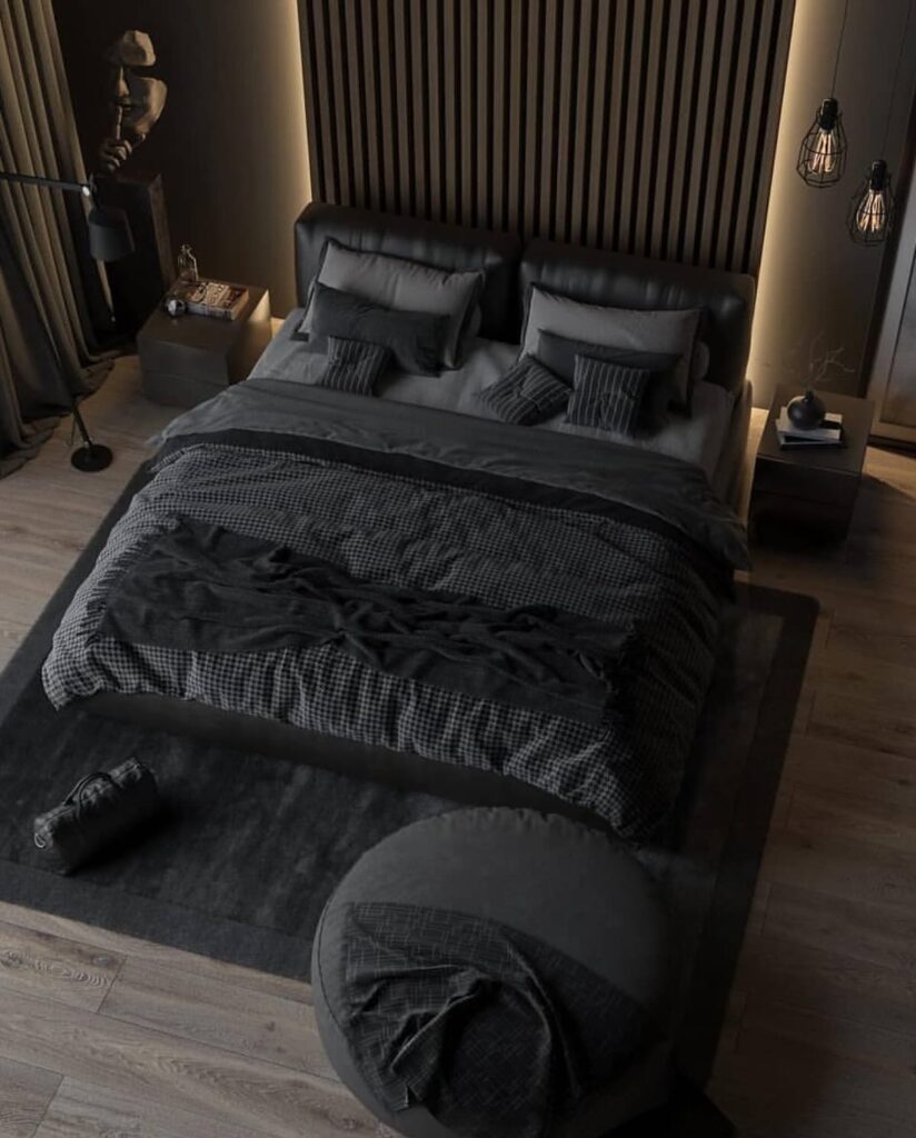 Pro tip: Keep bedding monochrome (like black or charcoal) and let lighting and textures do the talking.