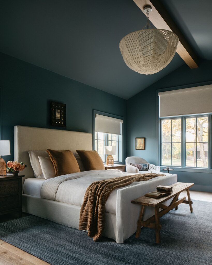 Here’s a quick trick: take blue bedding, a dark headboard, and toss in an orange throw blanket. Add a cozy chair and a bedside lamp, and you’ve created a warm-cool contrast that feels balanced and inviting.