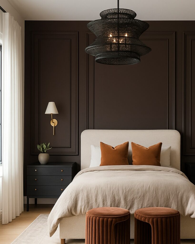 Dark brown walls may sound risky, but trust me—they can feel incredibly romantic. Pair them with a beige bed, orange pillows, a black chandelier, and ottomans at the foot of the bed. Suddenly your room feels like a cozy luxury suite.