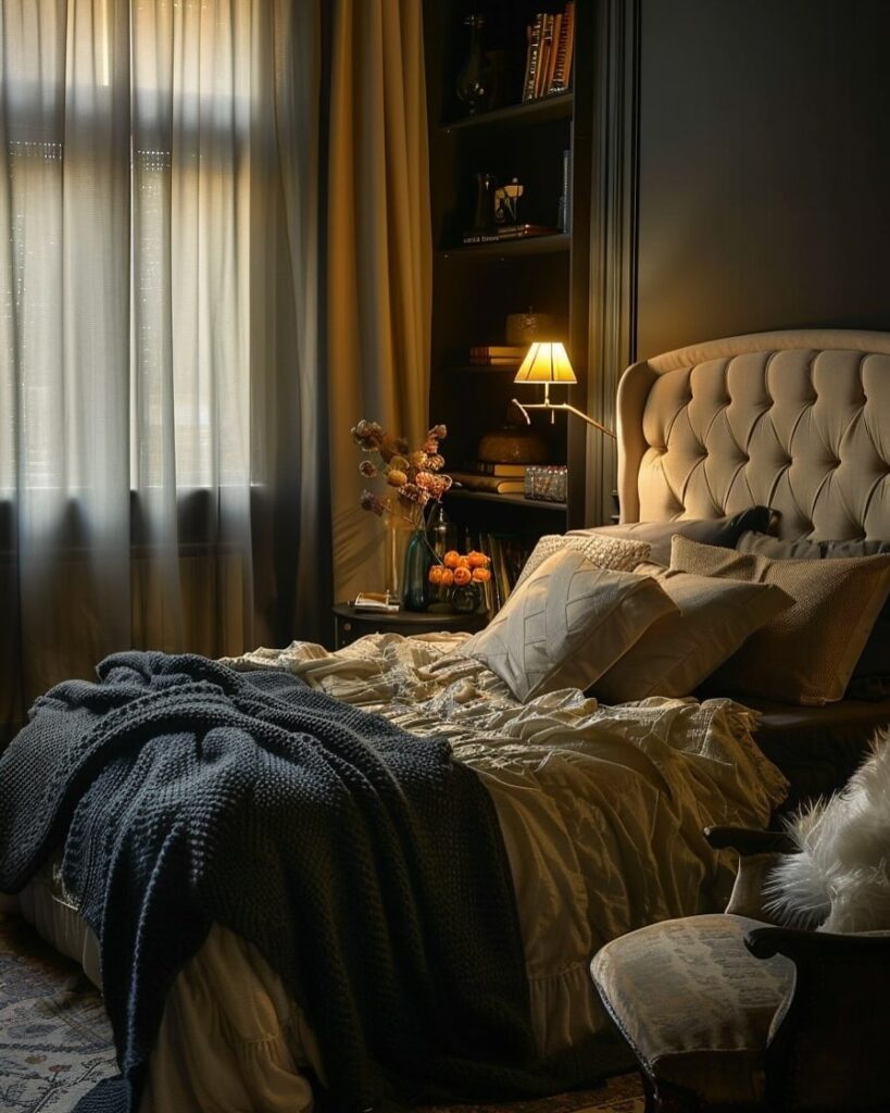 Not all moody bedrooms need to scream drama. Sometimes soft and snuggly wins. Picture a tufted headboard, soft bedding, and a chunky knitted throw. Add warm lighting, sheer curtains, and a vase of flowers, and you’ve created a romance-ready cocoon.