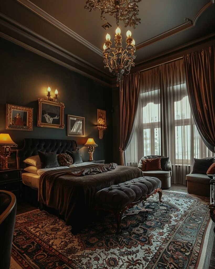 Want to go all out? Create a lavish setup with a tufted black headboard, ornate chandelier, dark curtains, plush seating, and artwork. Layer in a patterned rug, and you’ll feel like you’ve stepped into a five-star romantic getaway.
