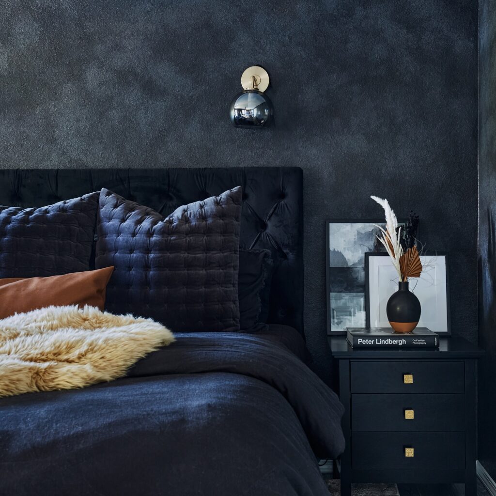 Pro tip: Don’t skimp on bedding. A plush, layered bed will balance the drama so it feels cozy, not cold.