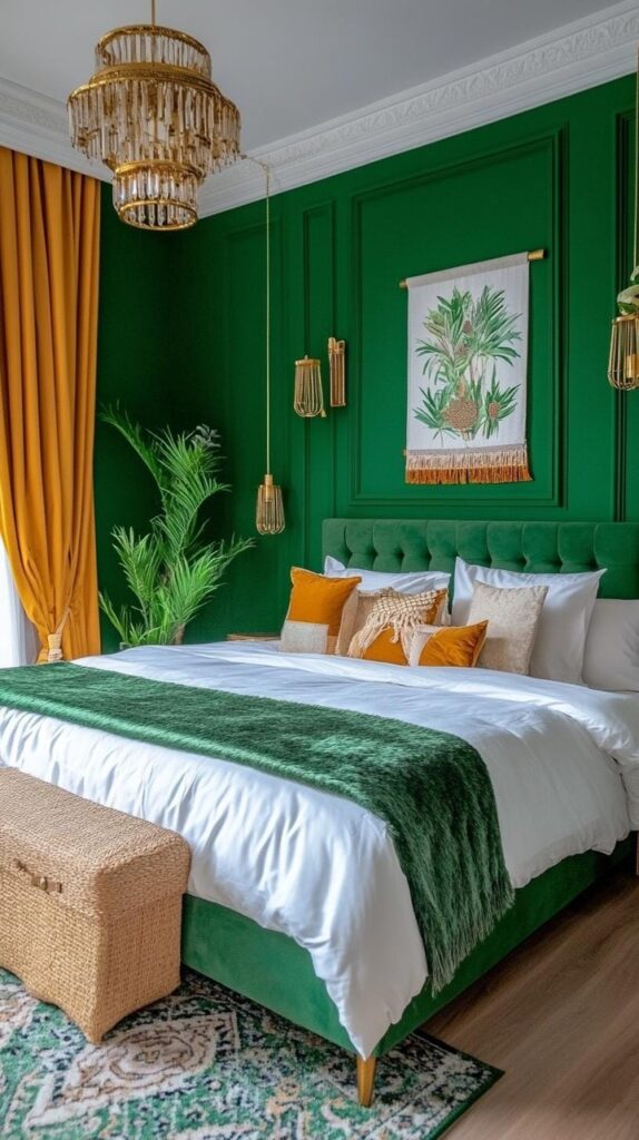 Who says moody bedrooms have to be all dark and somber? Paint your walls deep green, throw in a velvet bed frame, and spice it up with orange accents. Add plants and colorful pillows, and suddenly you’ve got a romantic vibe with personality.