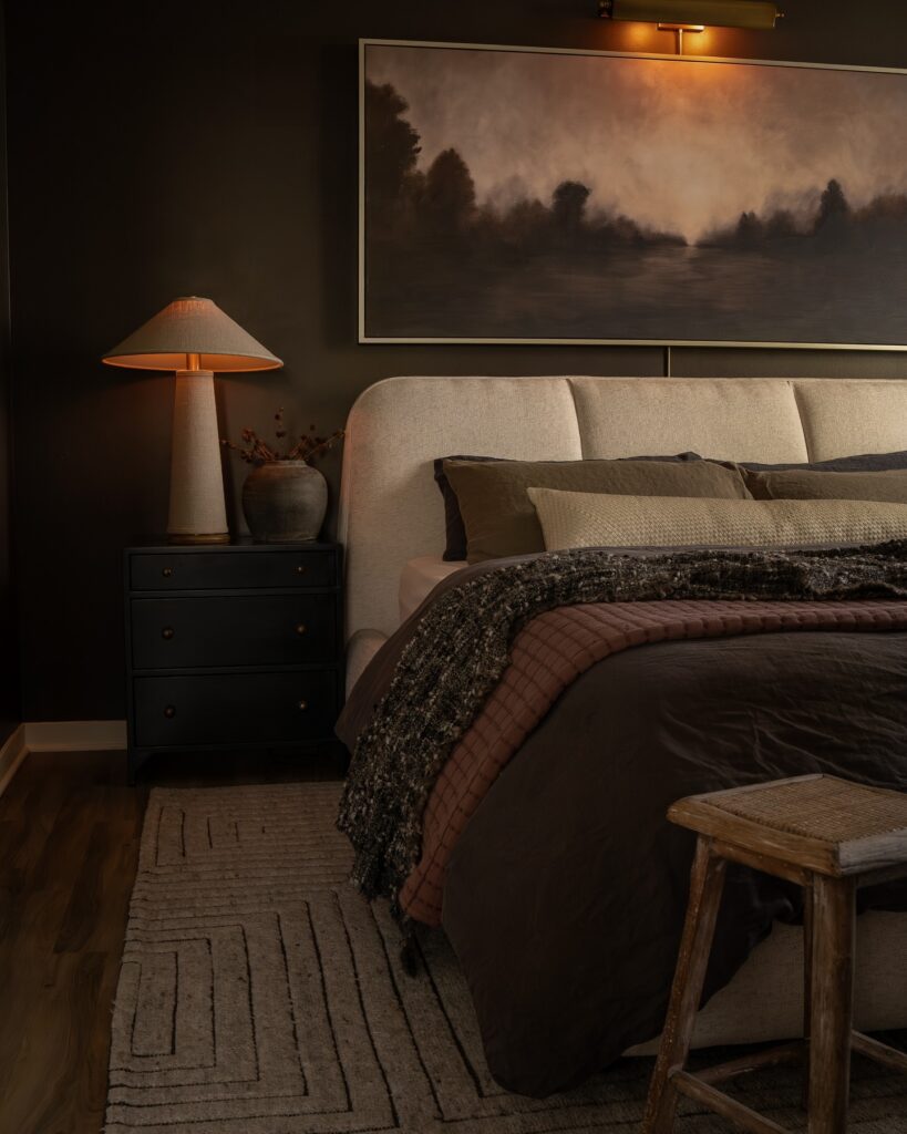 Maybe you’re into calm, earthy palettes. Imagine a beige headboard, dark bedding, earthy pillows, and a scenic painting above your bed. Add a small black nightstand with a lamp, and you’ve got a setup that feels elegant but cozy.