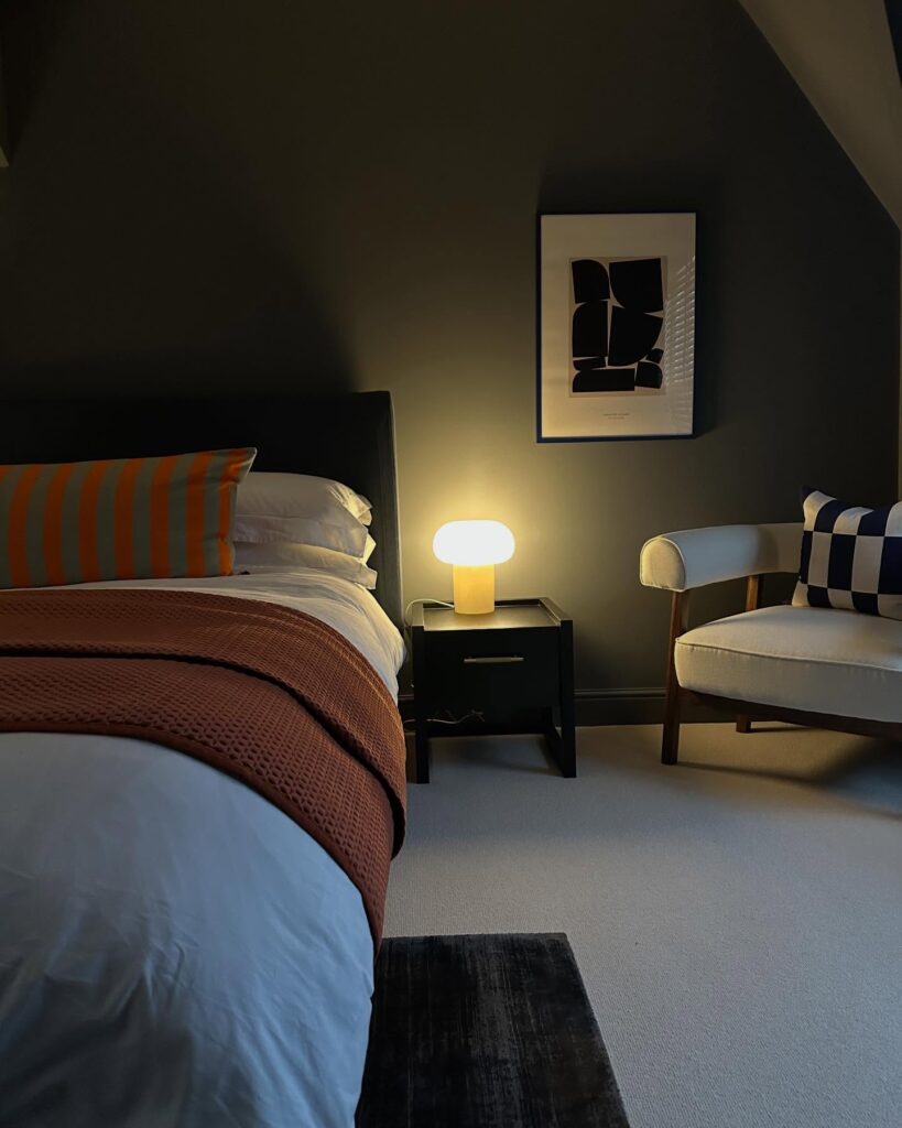 If you’re a fan of minimal drama, this one’s for you. A dark tufted headboard, black bedding, and a fluffy throw create instant intimacy. Add a sleek nightstand, a dried flower arrangement, and maybe even a book or two (because yes, styling your nightstand matters).
